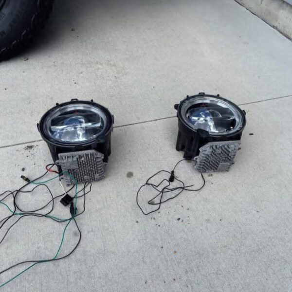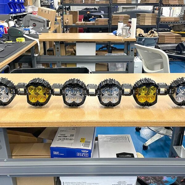 A set of Baja Designs LP4 Pro LED auxiliary lights mounted on a bar.